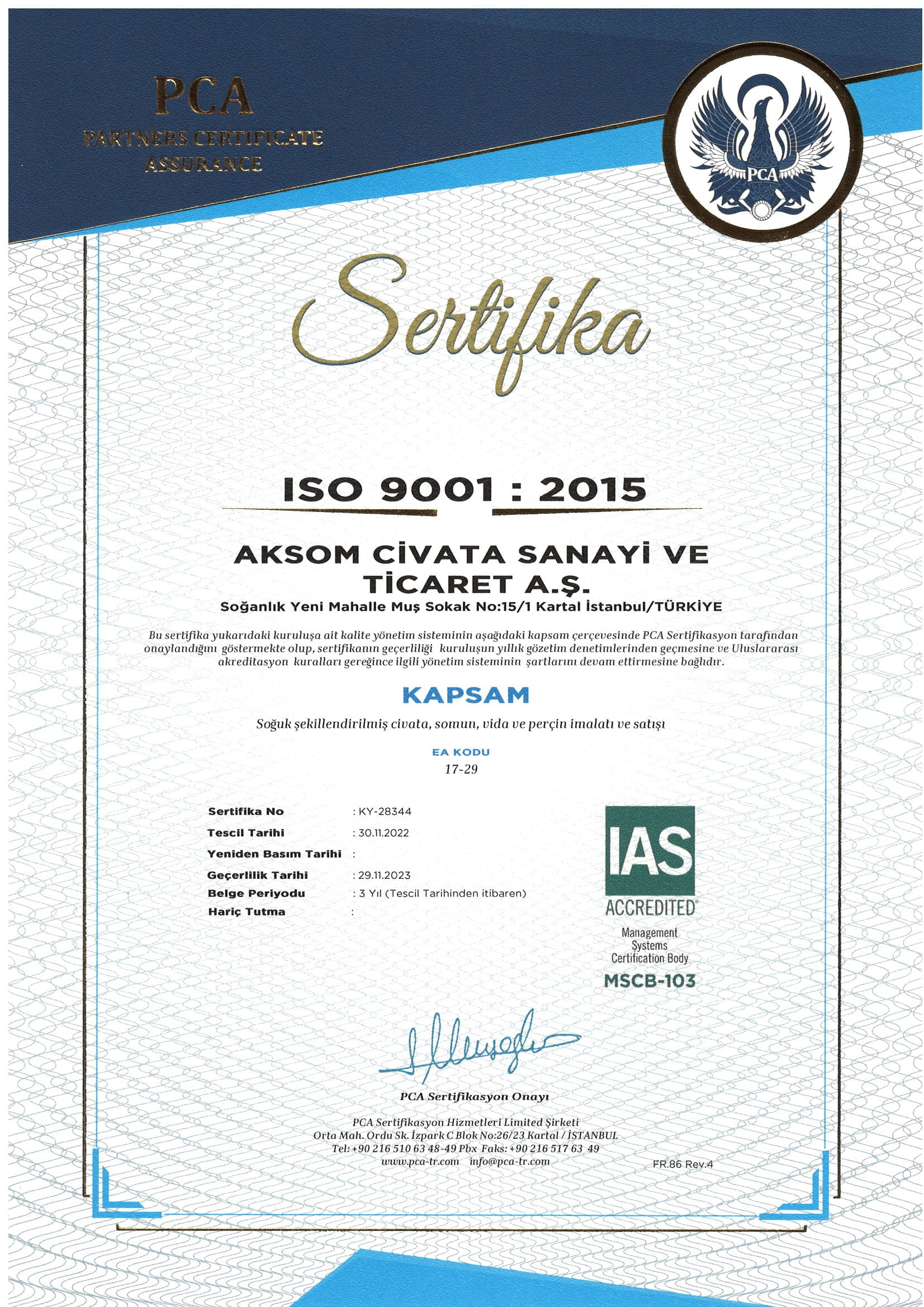 Belge kuruluşun ürün ve hizmetlerinin uluslararası kabul görmüş bir standarda uygun olarak üretildiğini gösterir.